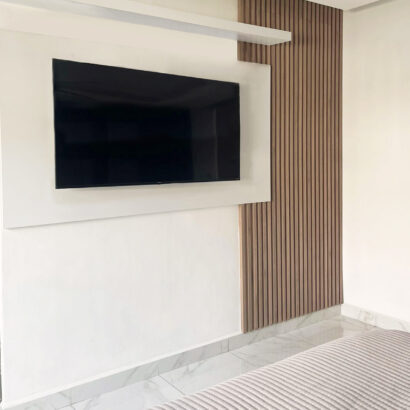 Instalación de centro de entretenimiento con repisa y vistas de madera