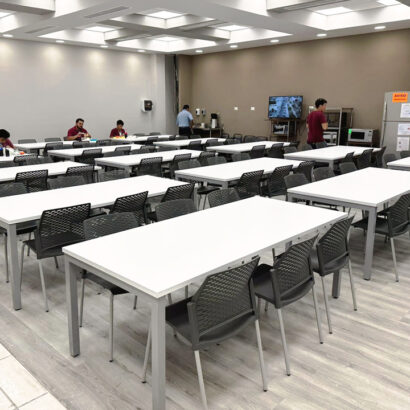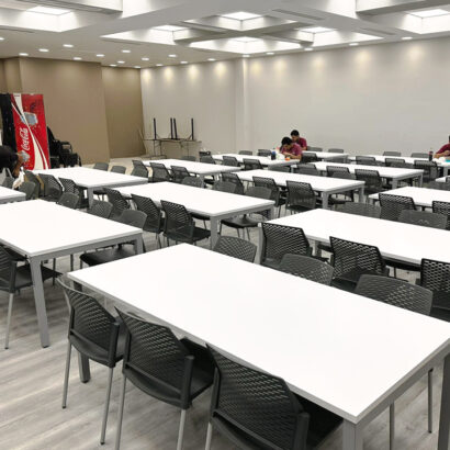 Instalación de sillería y mesas de comedor industrial para 6 personas con bases metálicas.