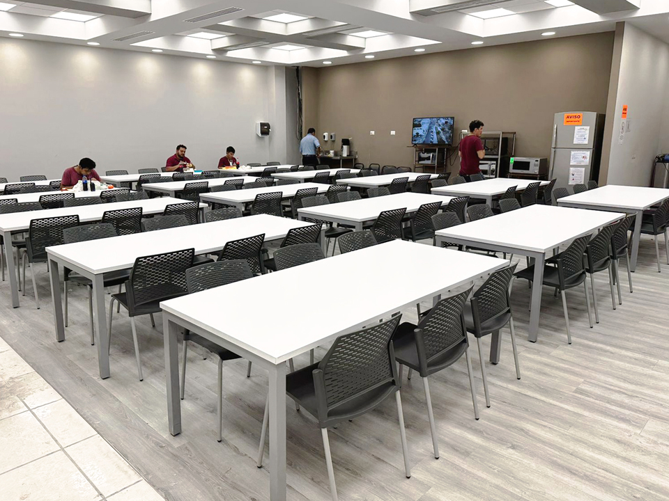 Instalación de sillería y mesas de comedor industrial para 6 personas con bases metálicas.