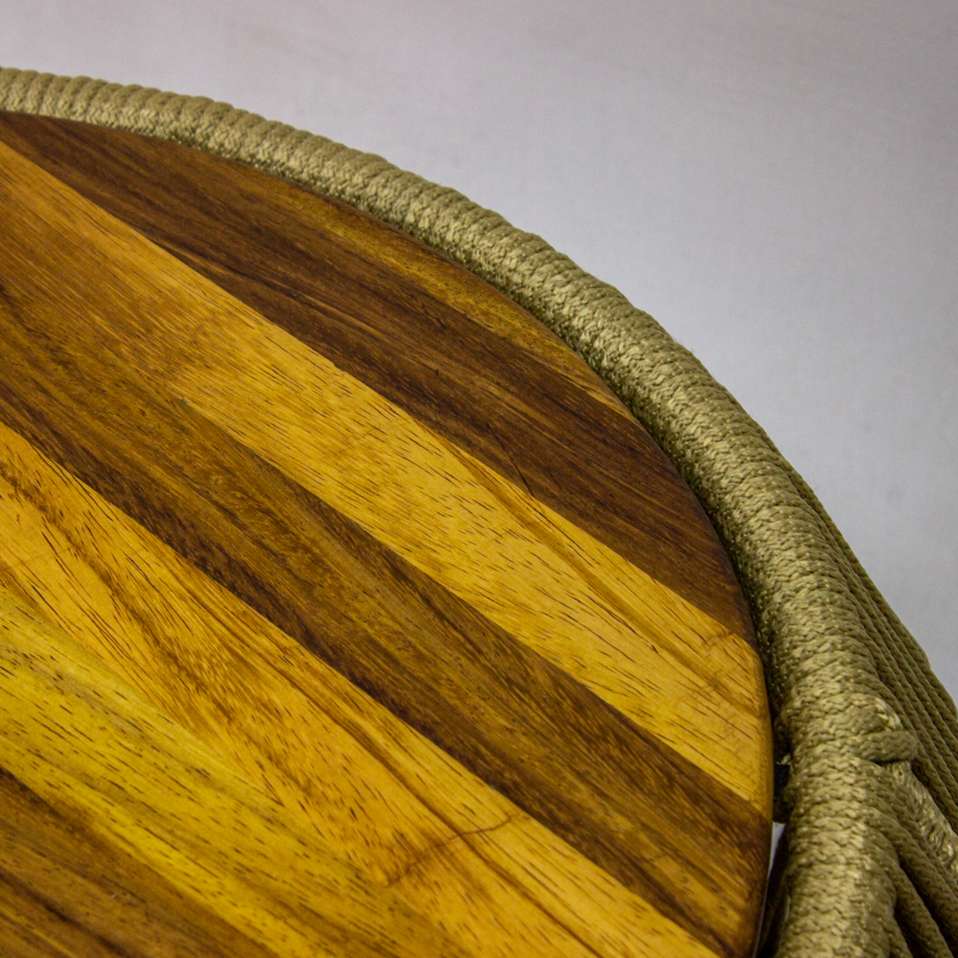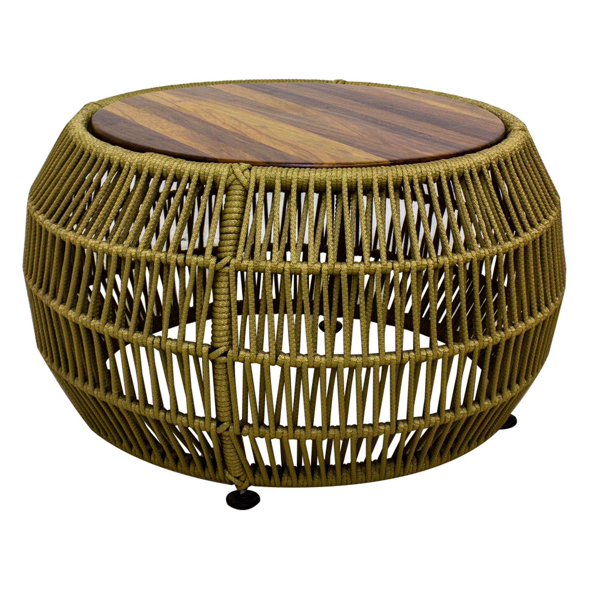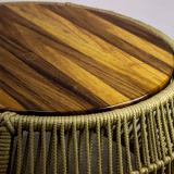 Mesa de centro hecha en acero con pintura electroestatica, tejido en cuerdade polipropileno y una cubierta en madera de parota..