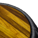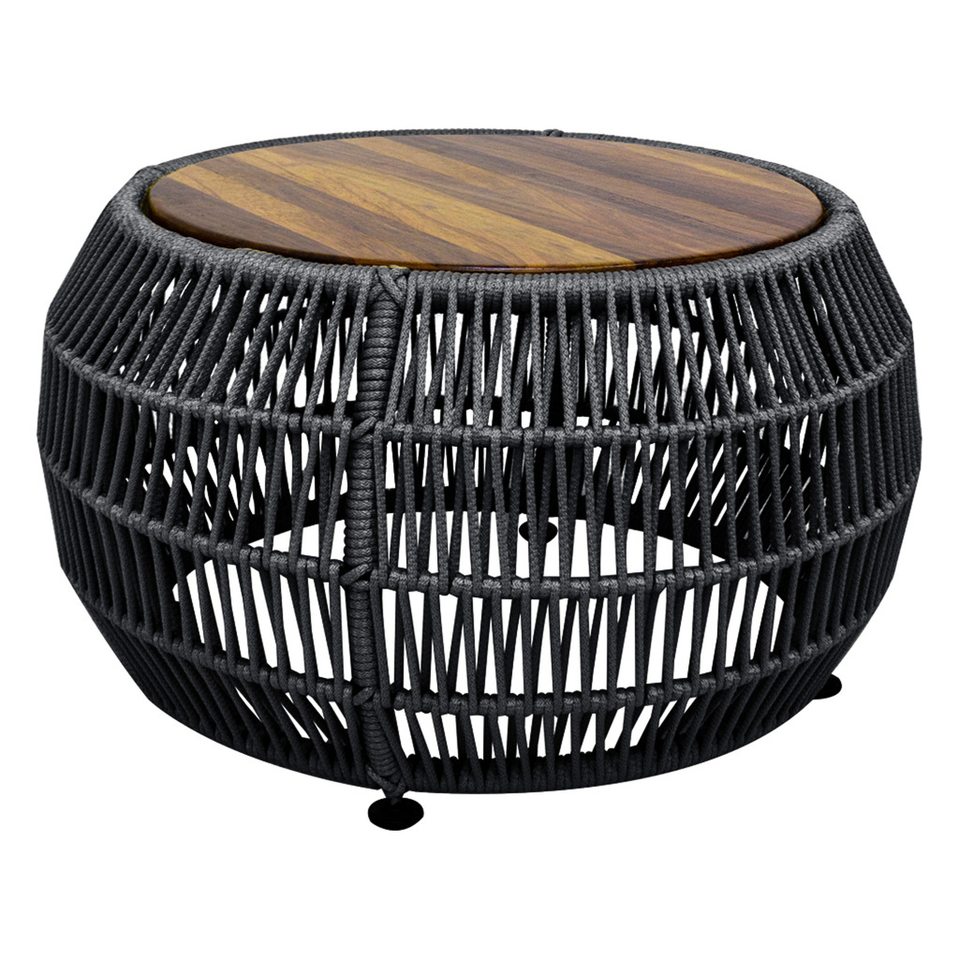 Mesa de centro hecha en acero con pintura electroestatica, tejido en cuerda de polipropileno y una cubierta en madera de parota..