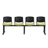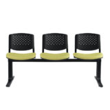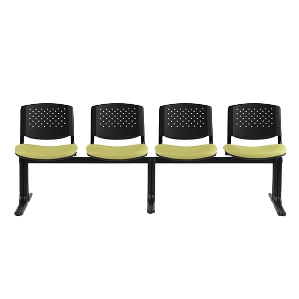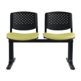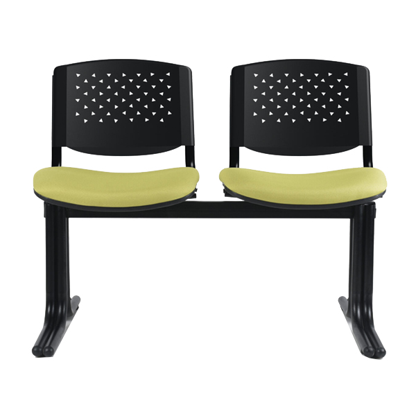 Silla fija con asiento y respaldo en polipropileno negro reforzado, con perforaciones para mejor ventilación. El asiento incluye acojinamiento de poliuretano flexible tapizado en tela. Base de PTR rectangular con soportes laterales y patas de doble tubo redondo de 1¼” en forma de escuadra.