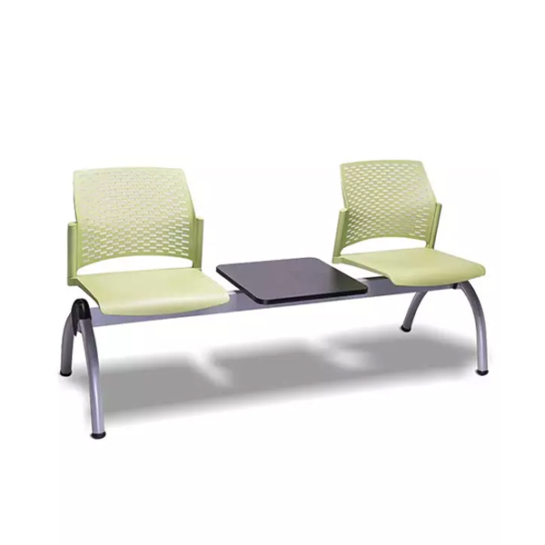 Banca con asiento y respaldo en polipropileno con mesa revistera intermedia, gris/verde.