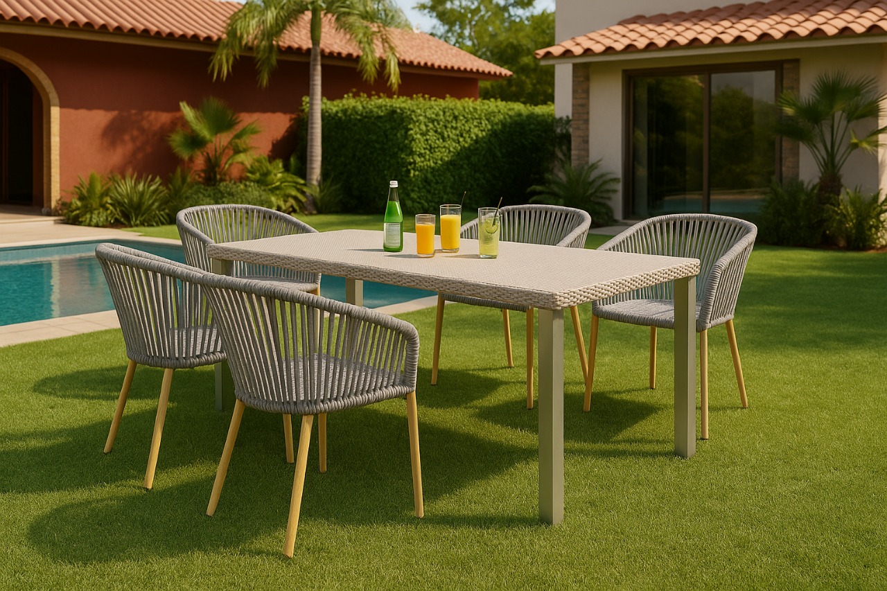 Mesa fabricada en metal y polipropileno simulando rattan tejido. ideal para que disfrutes tus espacios al exterior.