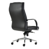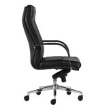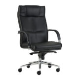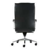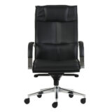 Sillón de respaldo alto con cabecera, brazos fijos de acero con pad en piel, asiento y respaldo de madera domada con acolchonamiento en poliuretano tapizado en piel. Mecanismo 3 a 1 de rodilla con 5 posiciones de bloqueo, pistón neumático, base pentagonal cromada y ruedas dobles de nylon.