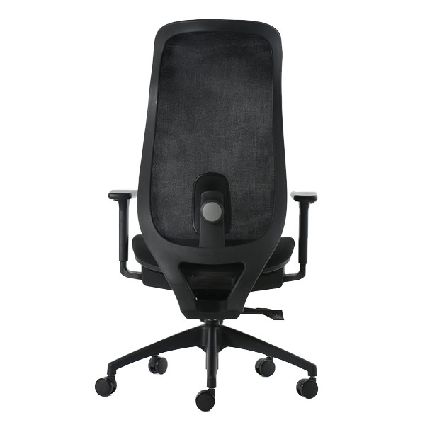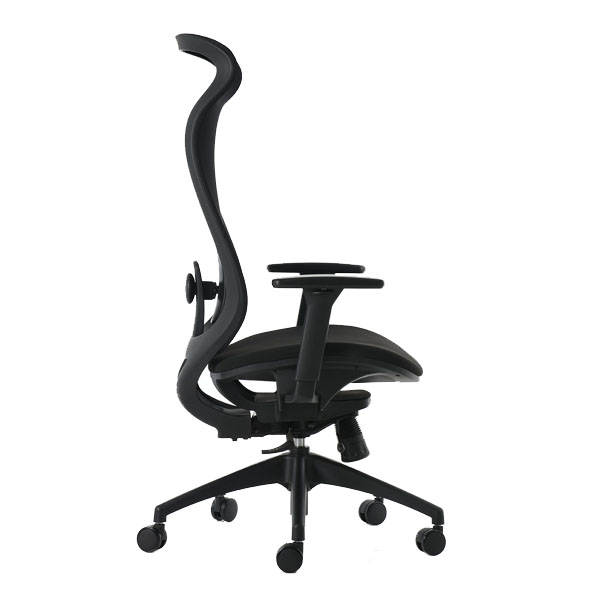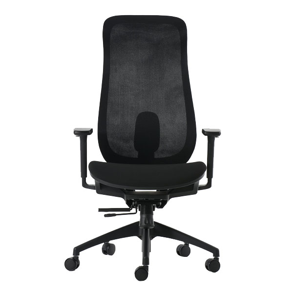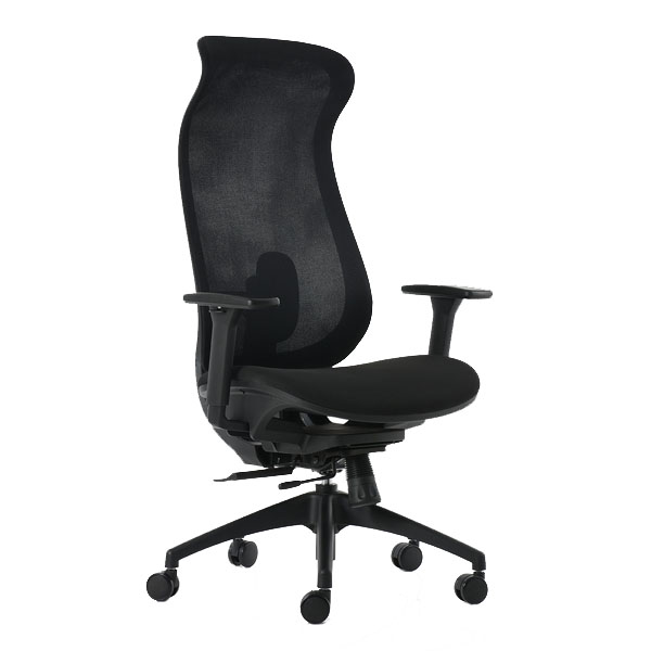 Silla de dirección de respaldo alto con cabecera integrada, brazos 3D ajustables, base negra de 5 puntas con ruedas de 60 mm, respaldo en malla soft y asiento en tela negra. Mecanismo synchro con slide, 4 posiciones de bloqueo y anti-shock.