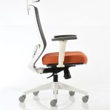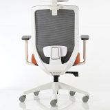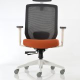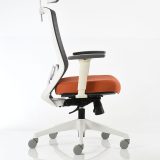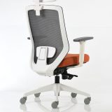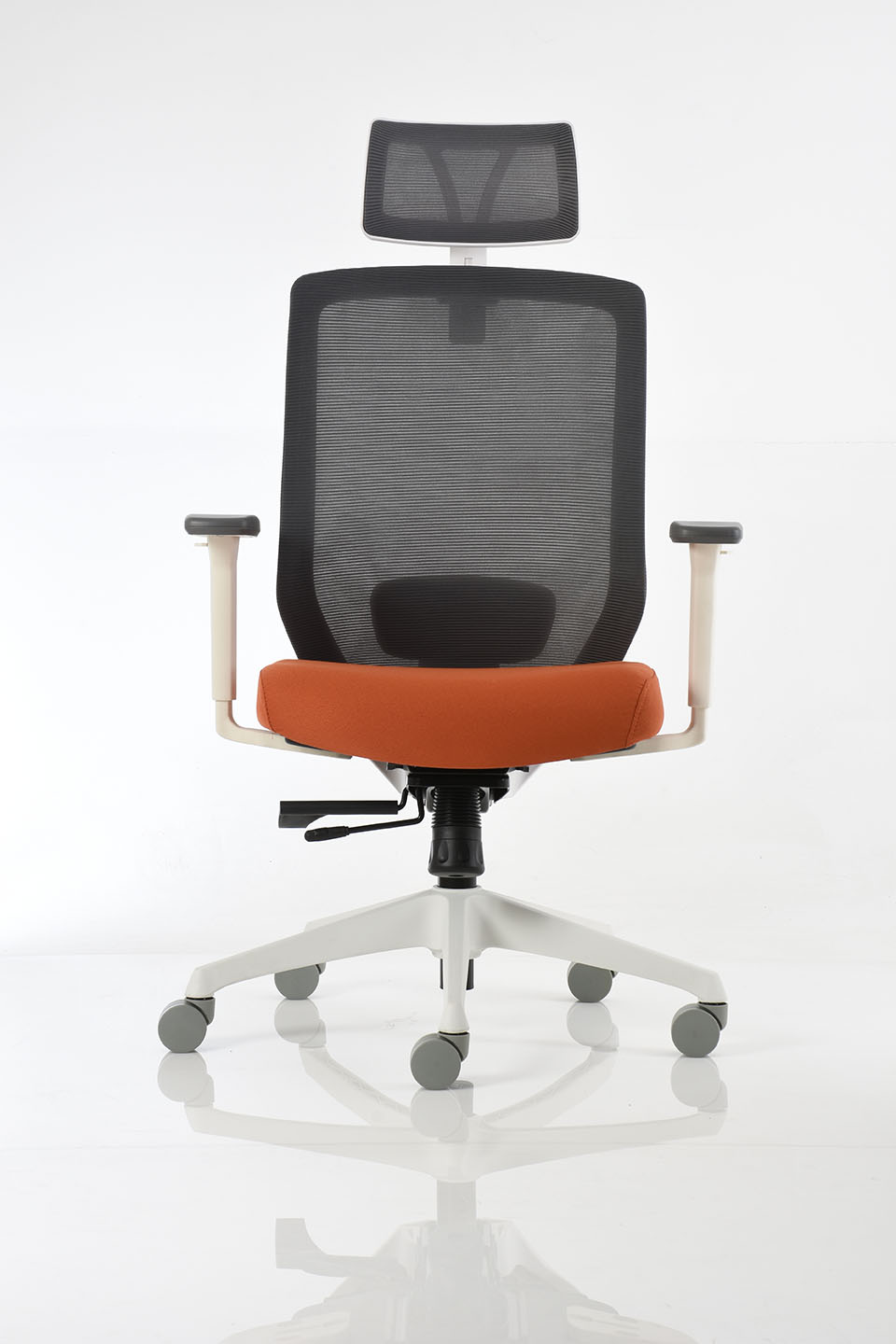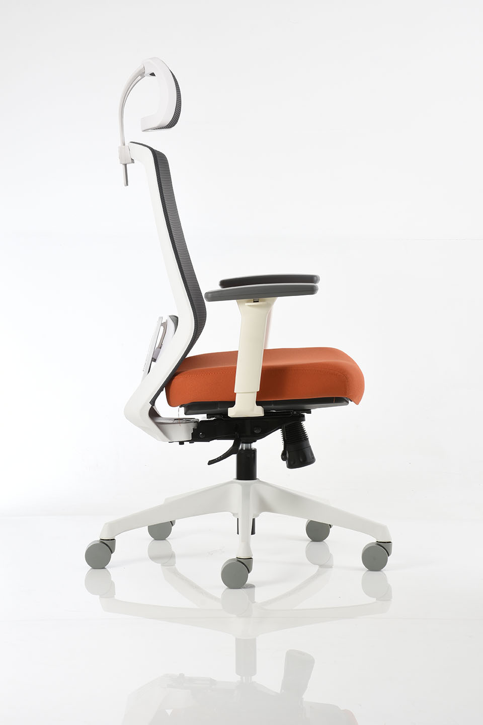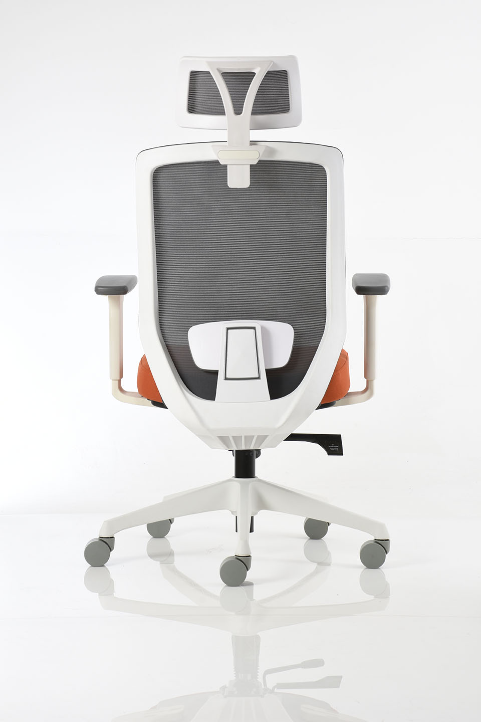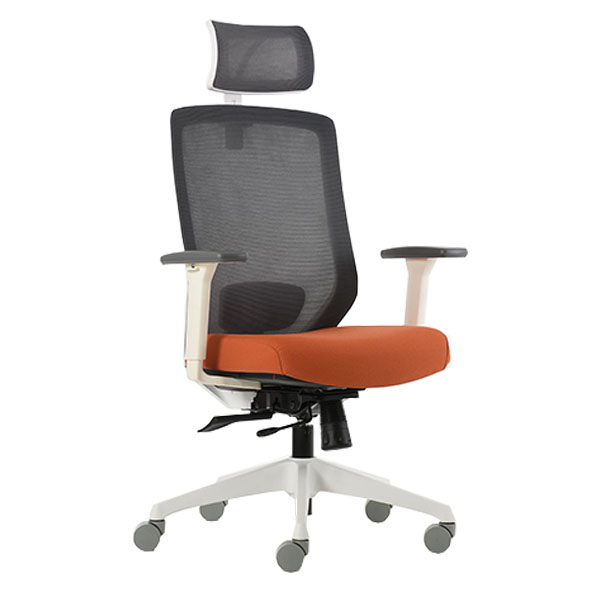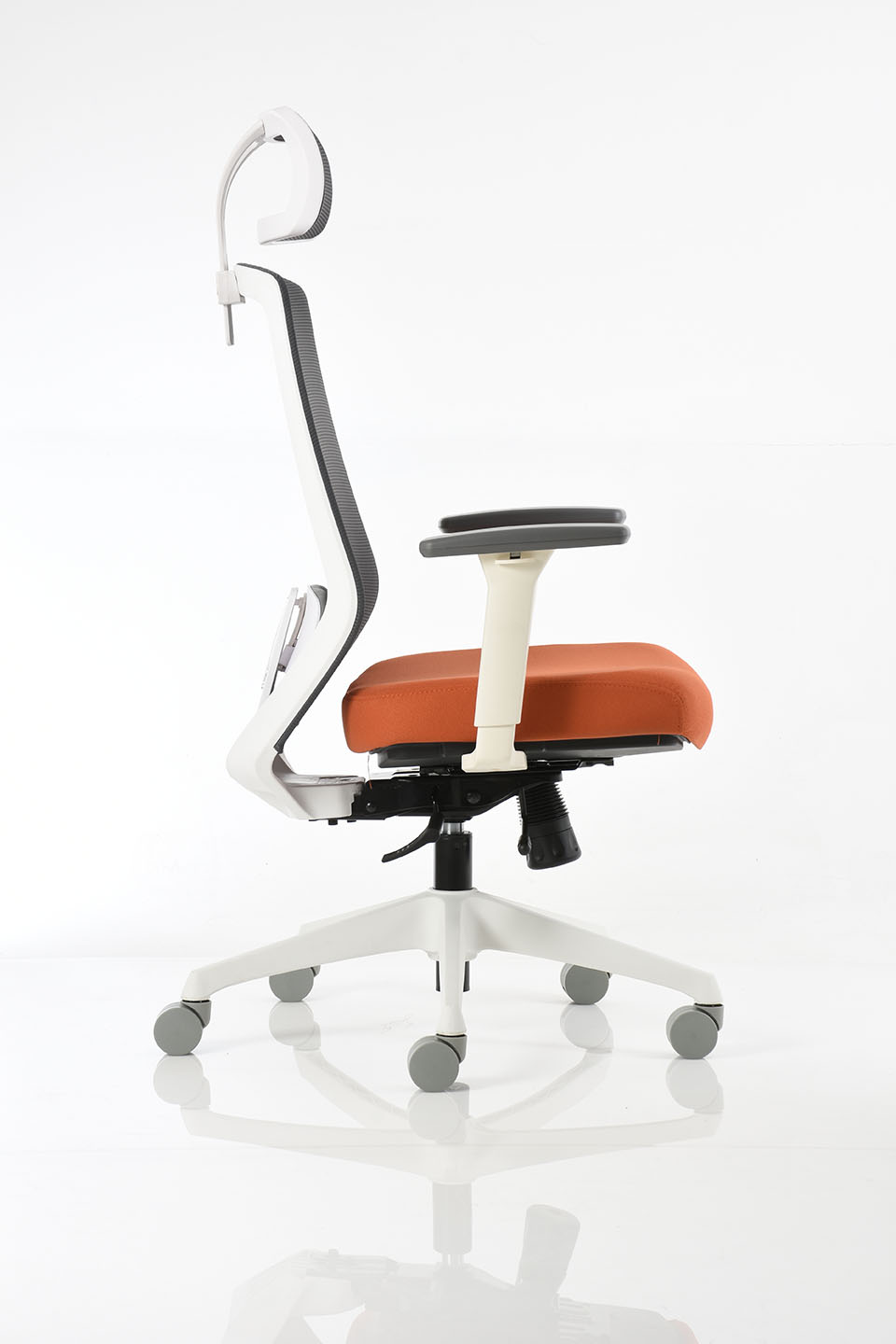 Silla de respaldo alto con cabecera, estructura blanca, mecanismo synchro de dos palancas, brazos blancos con pad negro, base de 5 puntas con ruedas negras de 60 mm, respaldo en malla y asiento en tela.