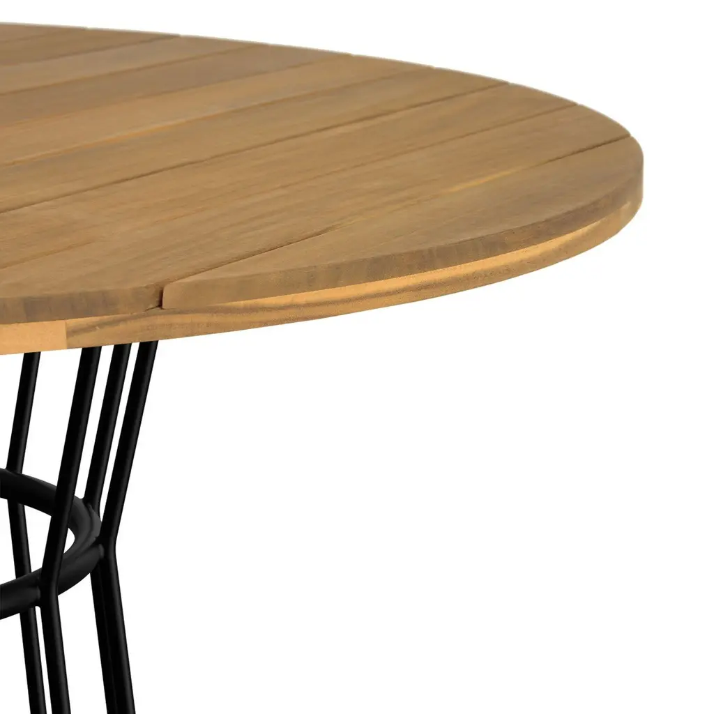 Mesa comedor con cubierta de madera parota y base de acero con terminado en pintura electroestática, apta para exterior techado..