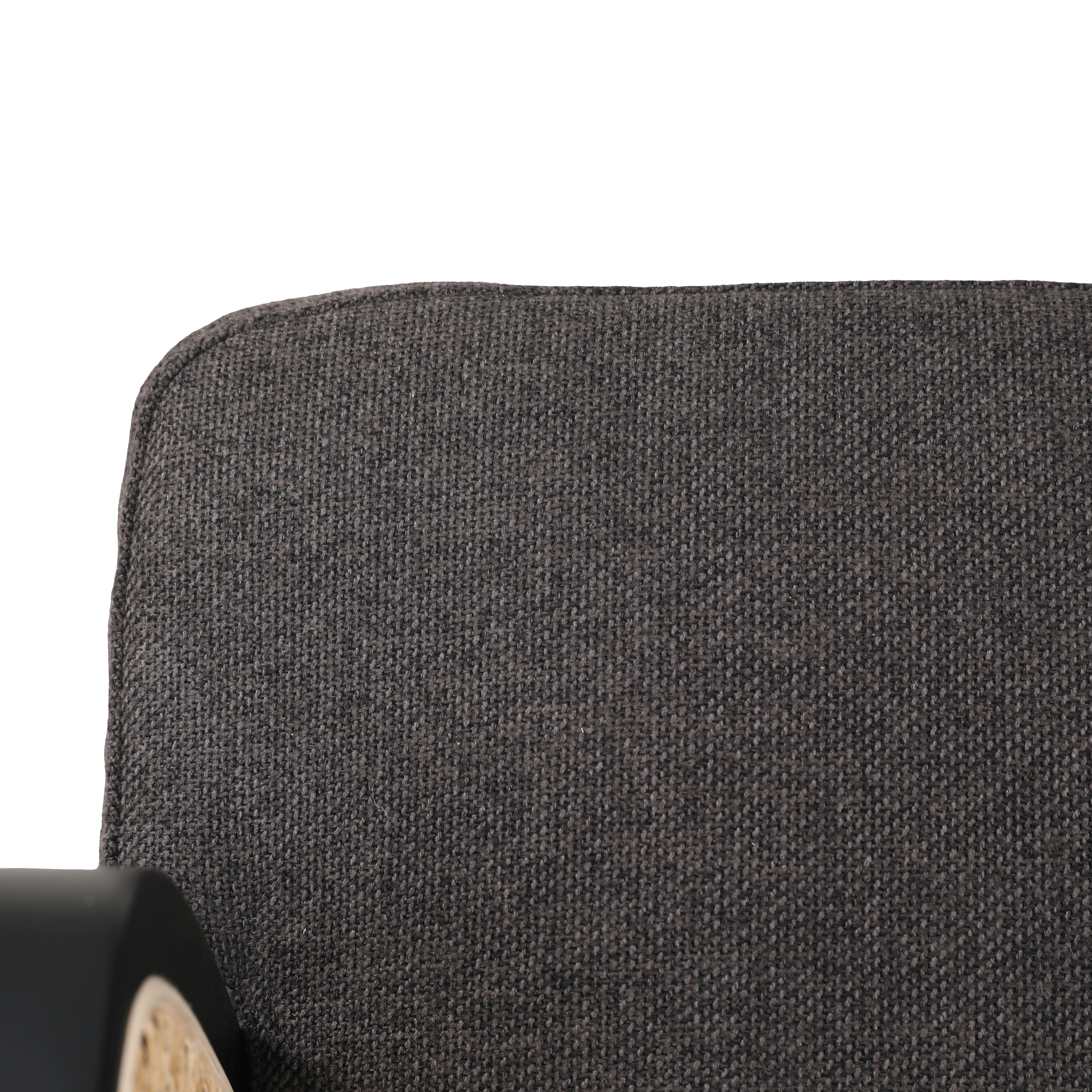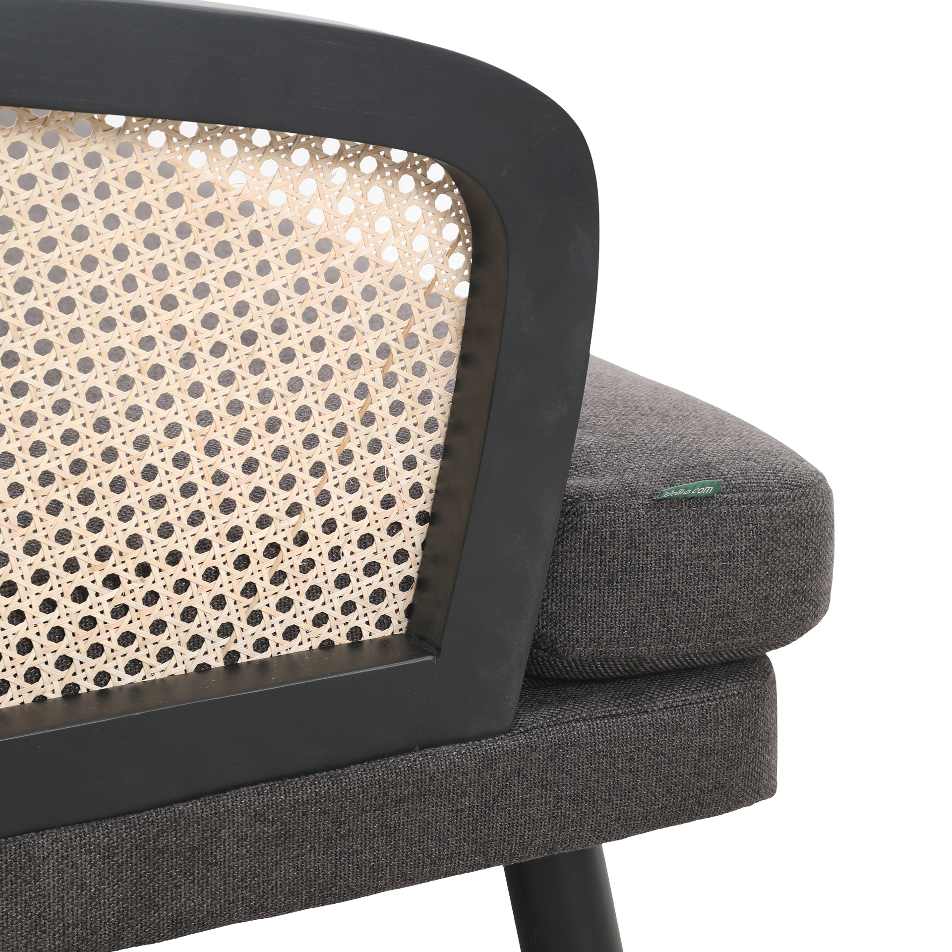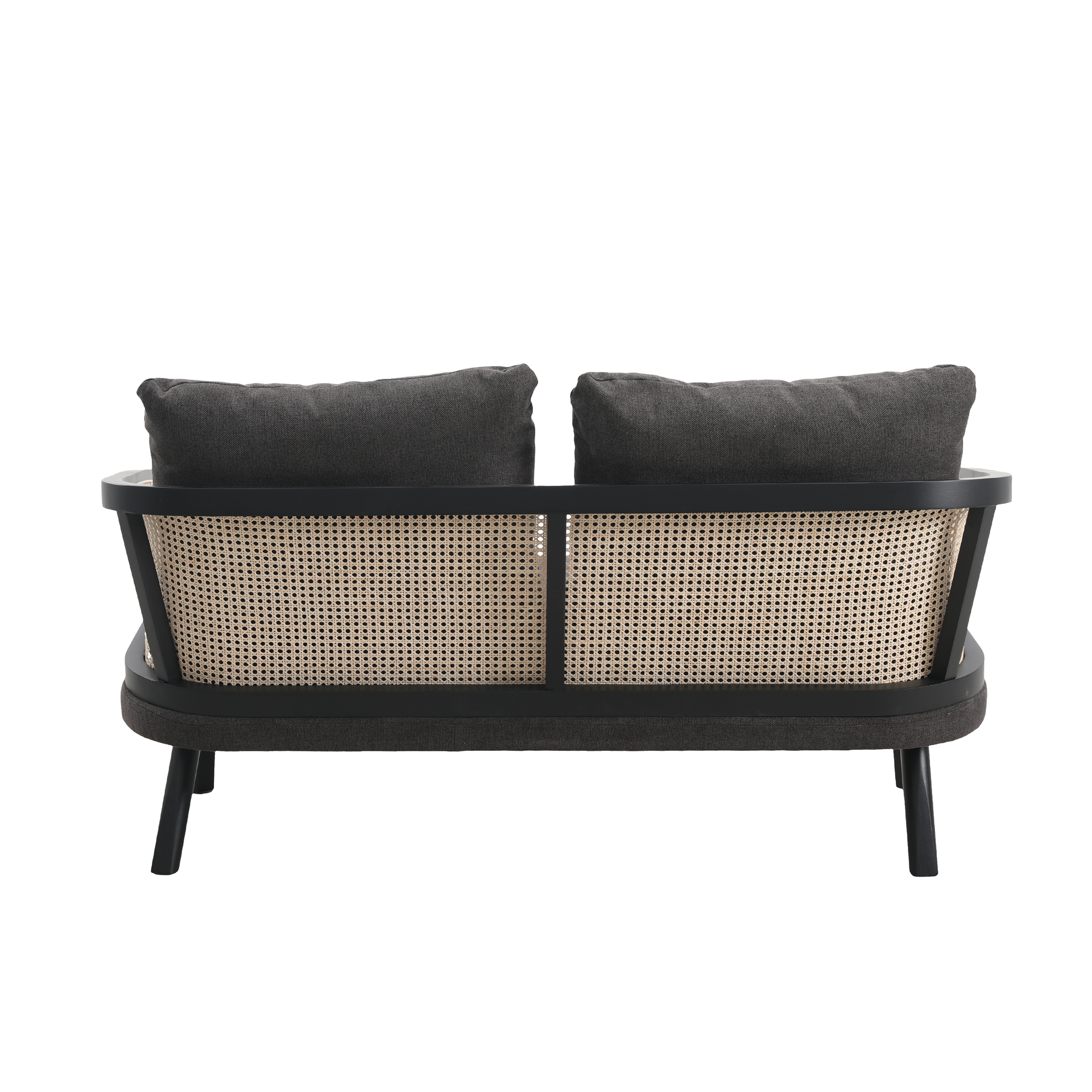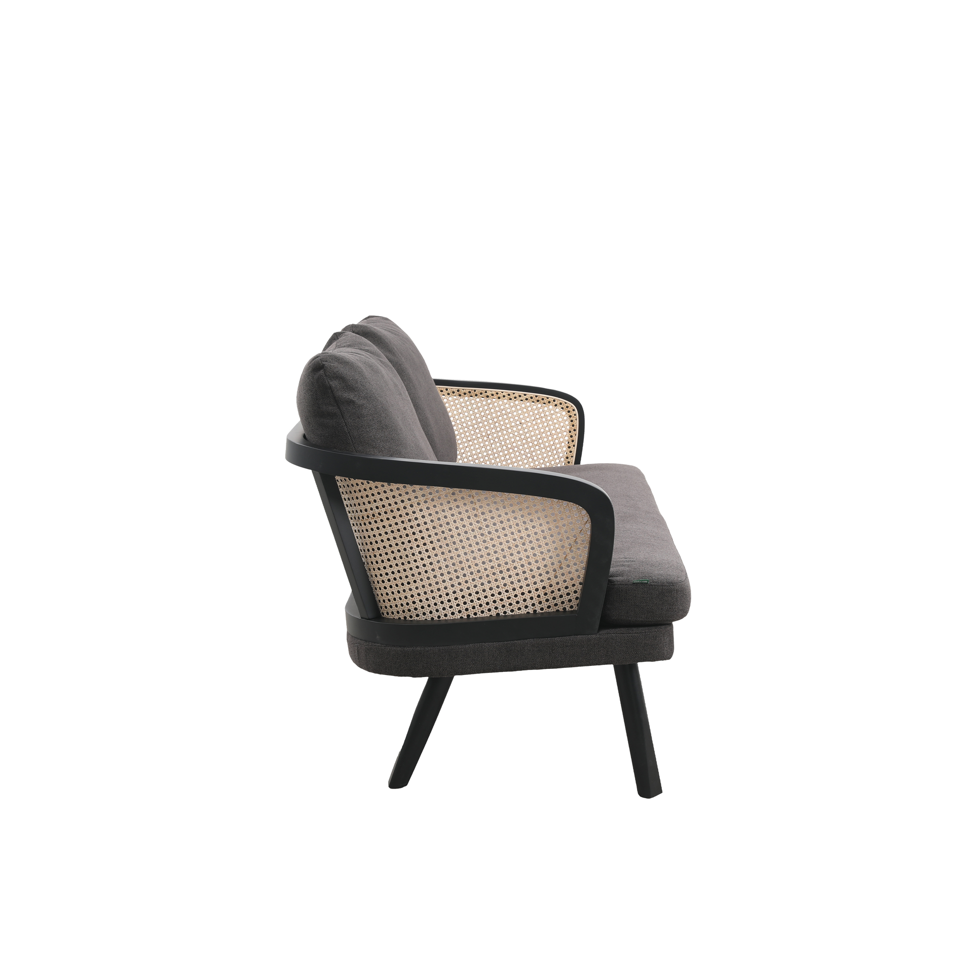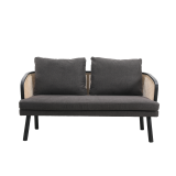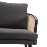 Cinque terre sofá, fabricado madera de haya color negro, ratán natural. Tapizado en tela color gris.
