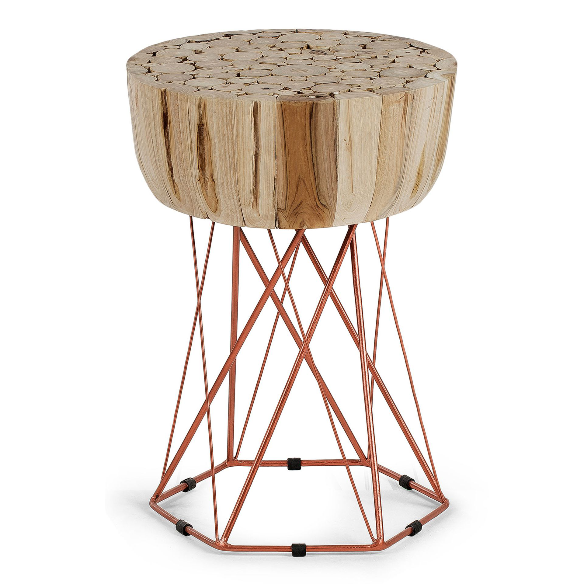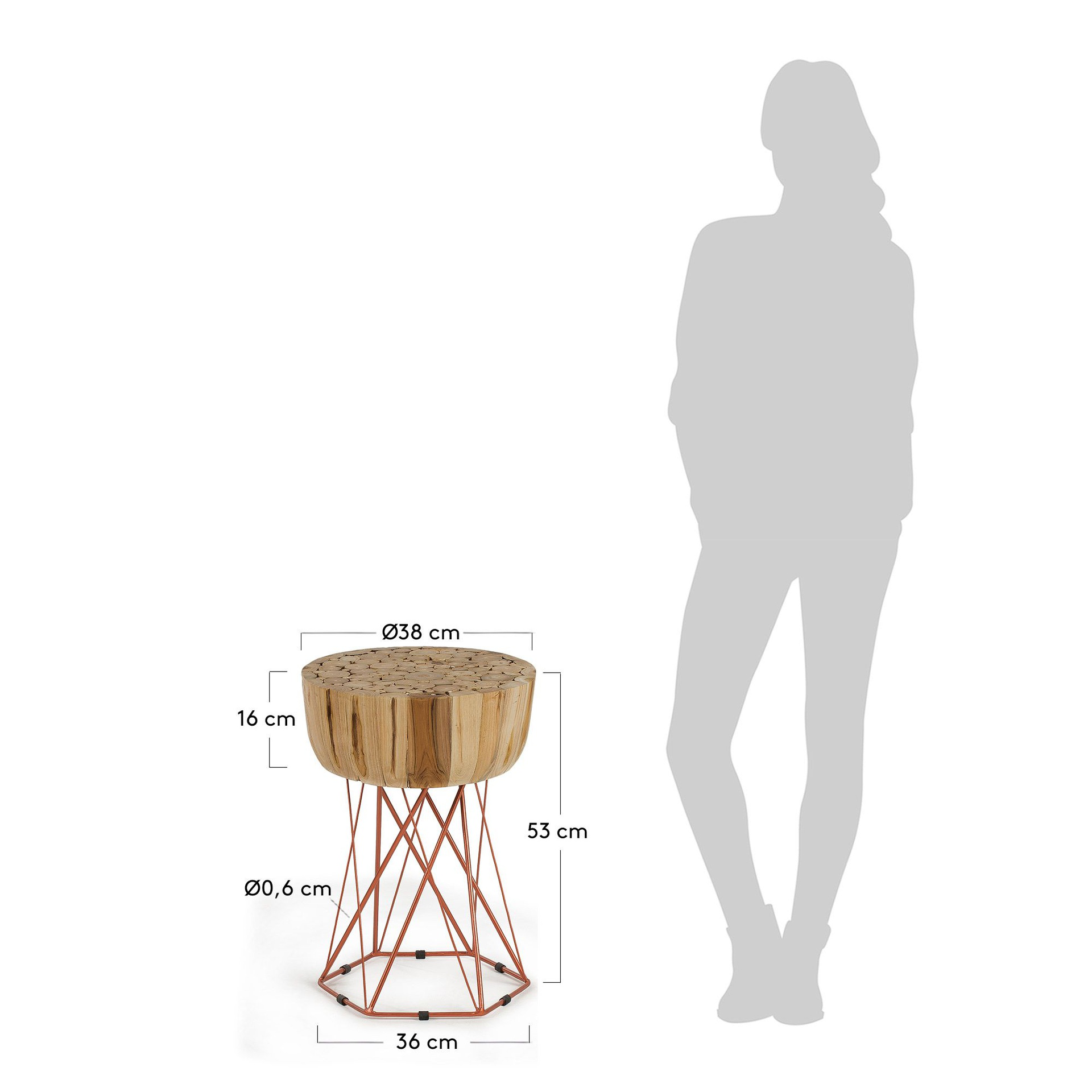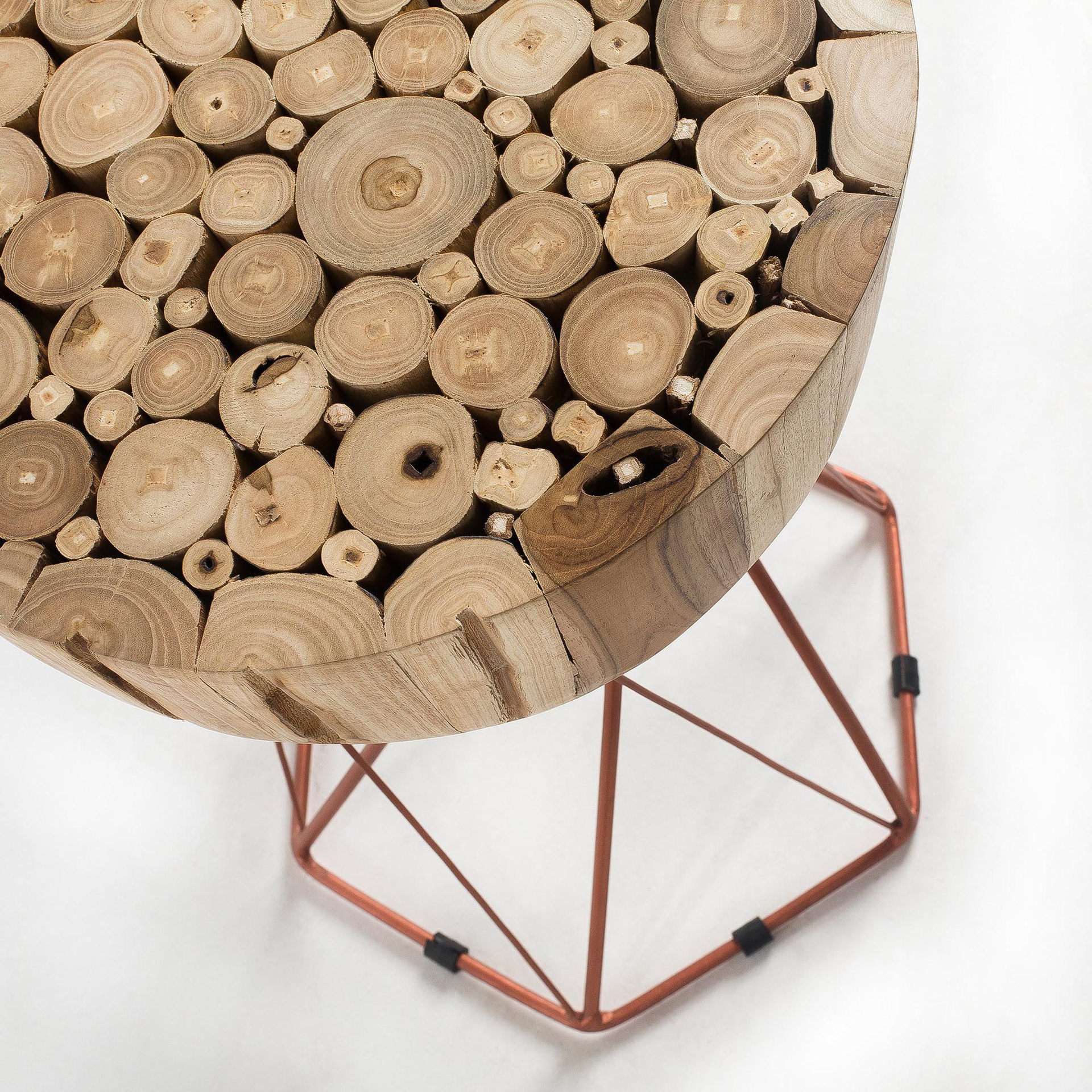 Esta mesa auxiliar combina una estructura de metal con un sobre hecho de troncos de madera de teca, ofreciendo una mezcla de robustez y calidez natural. Perfecta para añadir un acento rústico y elegante a cualquier espacio.