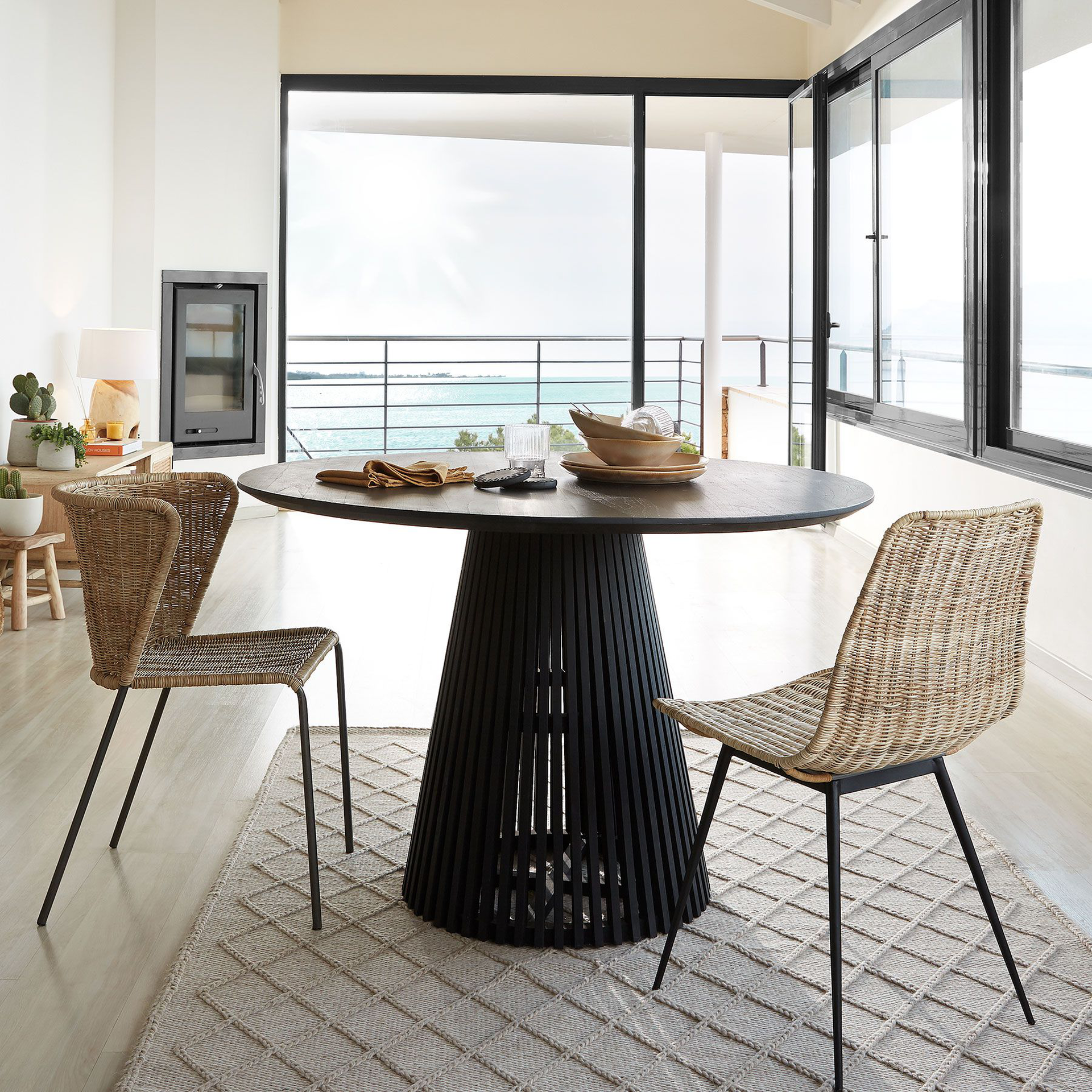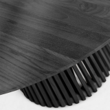 Madera maciza de mindi con un acabado negro 120 Ø, dejando ver las vetas que hacen exclusiva cada mesa. Además, el pie tiene un original diseño de piezas hechas con el mismo tipo de madera y acabado, colocadas una a una. La madera tiene el certificado FLEGT, por lo que también es ecofriendly, ya que viene de una tala responsable y bosques sostenibles. Una pieza única y auténtica como tú.