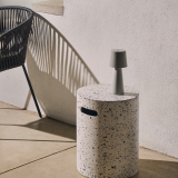 Mesa Auxiliar de terrazo, con forma redonda con dos agujeros pensados para transportarlo cómodamente. El terrazo tolera los rayos UV, además de calentarse mucho menos que el metal. Hecho con materiales naturales, por lo que cada uno será exclusivo, con tonalidades y texturas propias. Apto para interiores y exteriores.