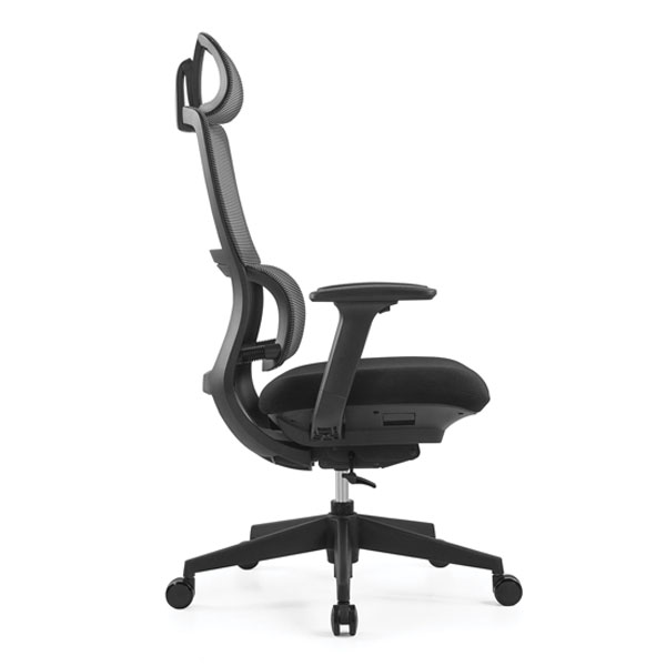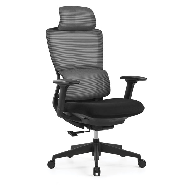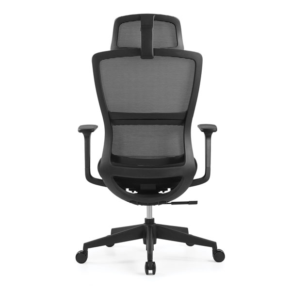 Silla ergonómica con base de 5 puntas en poliamida y rodajas duales. Ajuste de altura mediante pistón neumático y mecanismo synchro “Smart Tilt” con anti-shock, bloqueo en 3 posiciones y slider de asiento ajustable. Brazos 3D en polipropileno suave con pad de poliuretano. Respaldo de malla ergonómica con soporte lumbar flotante y asiento con espuma de alta densidad retardante a la flama. Tapicería en malla y tela negra (no retapizable). Cabecera opcional.