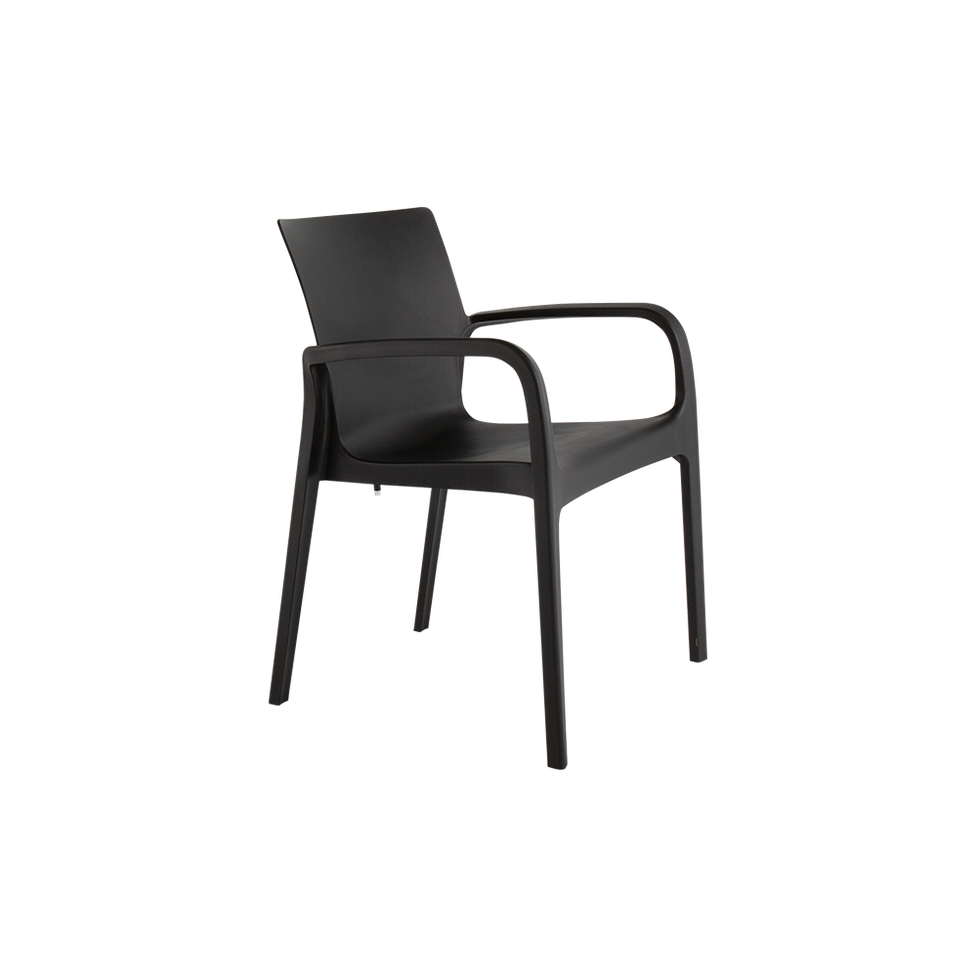 Silla plastica con descansa brazo fabricada en polipropileno con protección UV, ligera y estibable. Medidas 58*60*79.5 cm.
