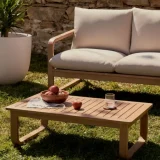 Mesa de centro exterior de madera maciza de eucalipto. Complementa tu jardín con la colección Sacaleta, perfecta para los amantes de las formas geométricas. Crea un espacio con personalidad y confort gracias a su diseño de aristas redondeadas..