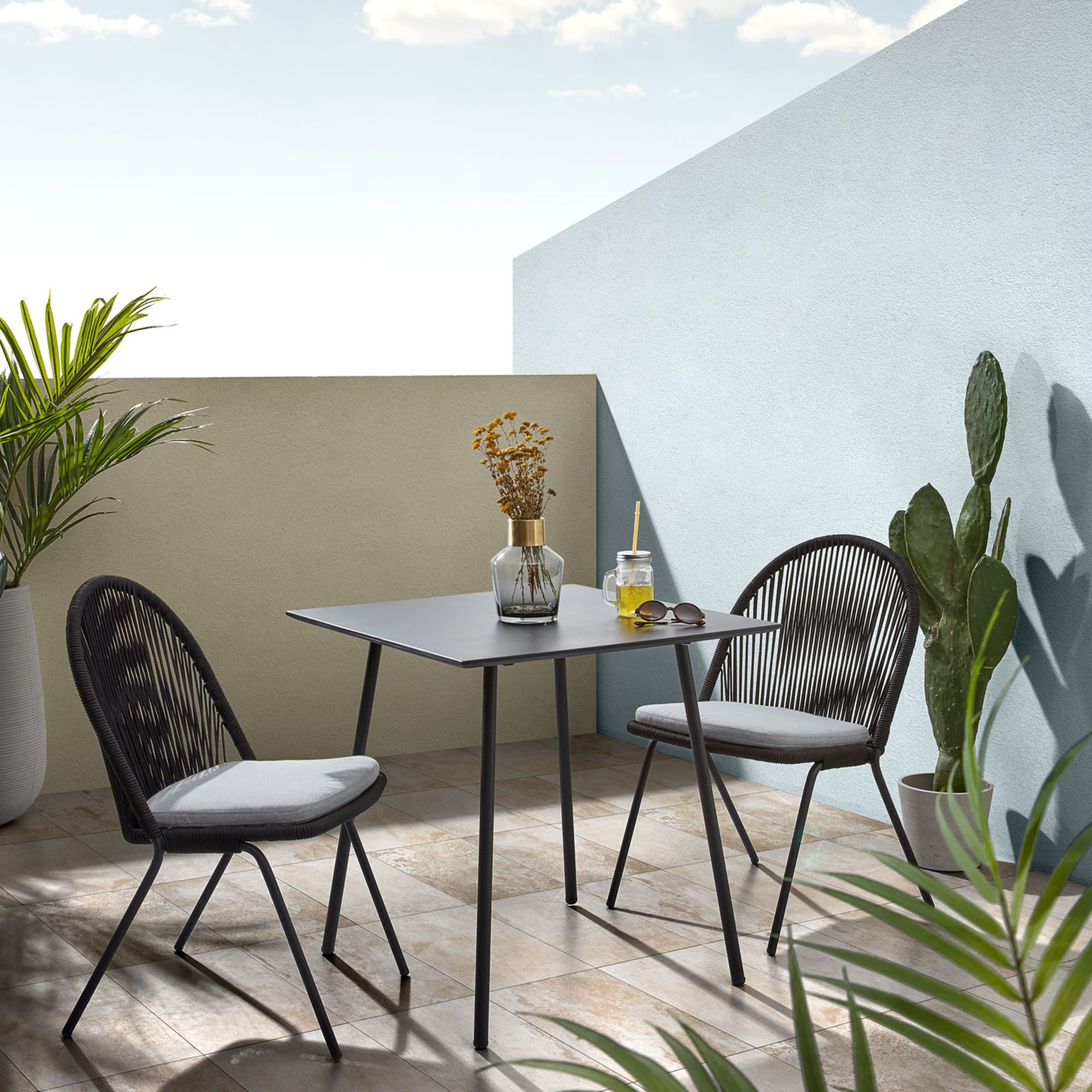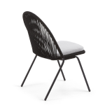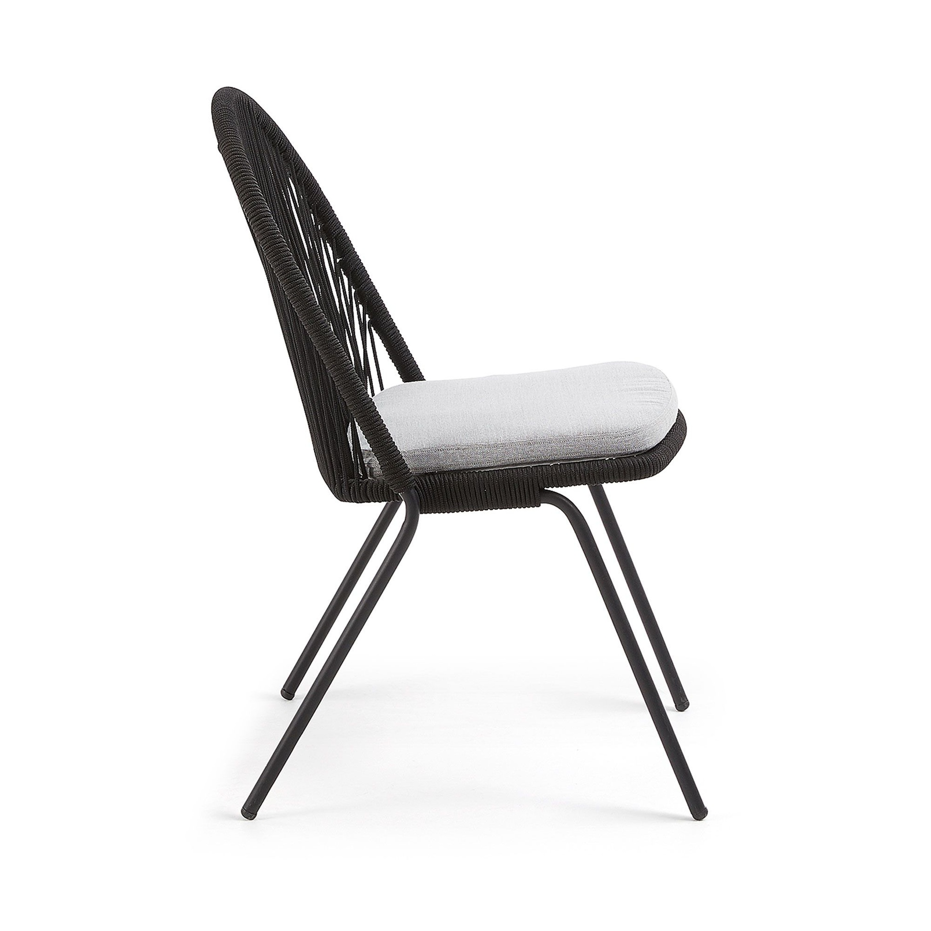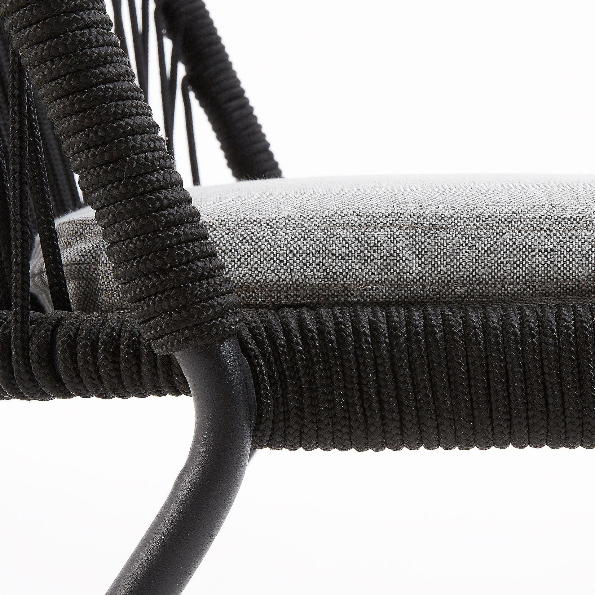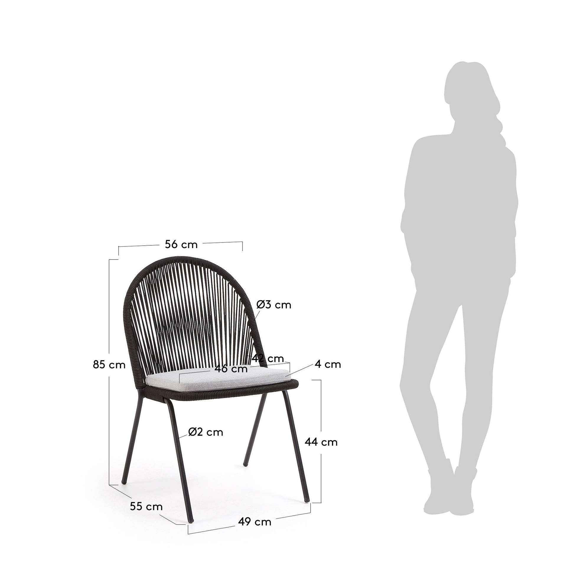 Silla con estructura en acero galvanizado pintado negro por pulverización. Asiento y respaldo en cuerda negra de poliester resistente a los rayos UV. Cojín gris claro incluido. Apilable. Para uso interior y exterior bajo techo.