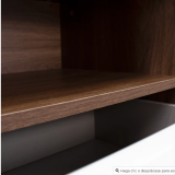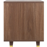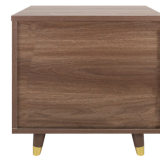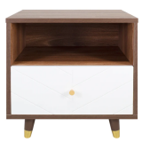 Buró fabricado con melamina color encino y frentes en melamina color blanco ranurada con diseño geométrico. Cajón con correderas de extensión y jaladera metálica dorada. Base fabricada en madera maciza color encino con detalles decorativos en parte inferior metálicas doradas.