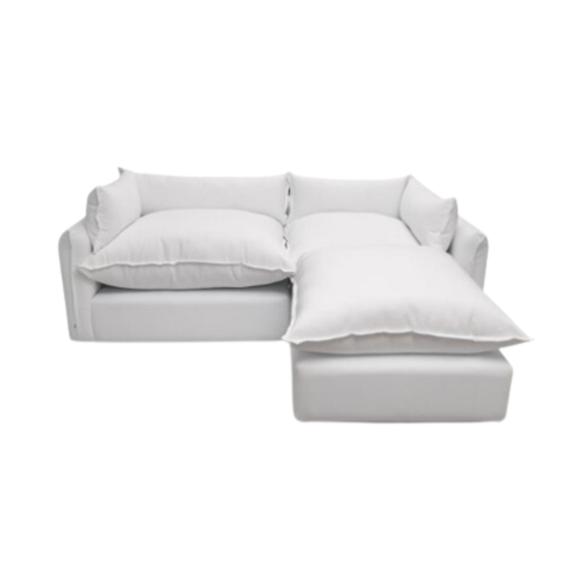 Sala tipo L con descansa pies movible. Relleno de microgel tipo nube, tapizado en tela tipo premium