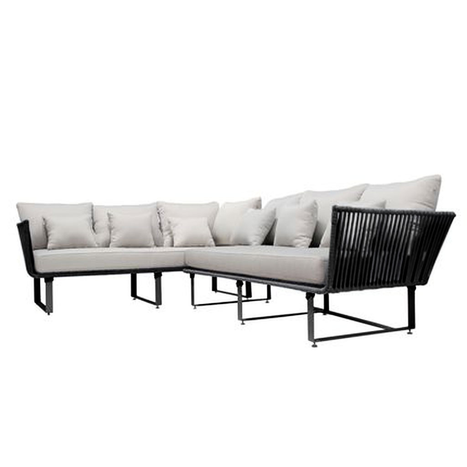 Nuestro lujoso set Vallarta esquinero esta fabricado en acero gris y cuerda de multifilamento de polipropileno de 16mm , Medidas: 190 cm largo x 82cm de profundidad x 70cm altura x 30cm altura piso asiento sin conjin, 42 cm con cojin. para uso exterior techado..