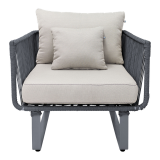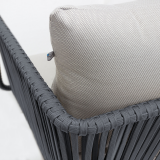 Para uso en exterior techado. Fabricado en acero con pintura electroestática y cuerda multifilamento de polipropileno (incluye cojinería en loneta de exterior)