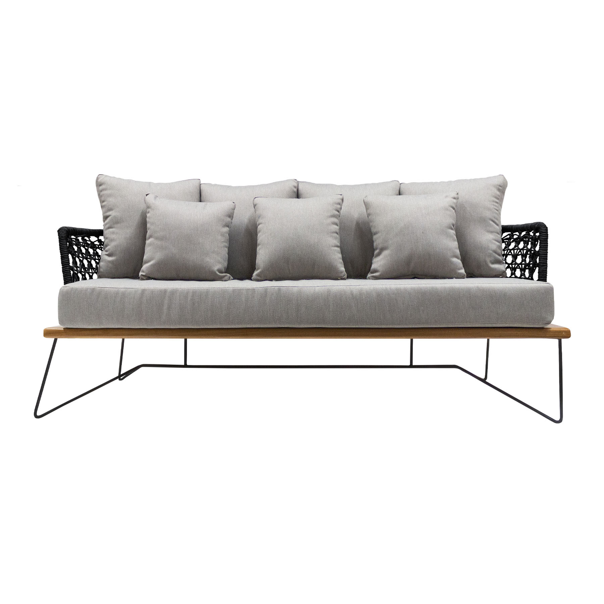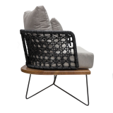 Para uso en exterior techado. Estructura respaldo acero en pintura epoxica tejida con cuerda trenzada de 6mm, asiento en madera de parota y base acero en pintura epoxica, incluye cojines..