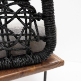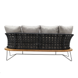 Para uso en exterior techado. Estructura respaldo acero en pintura epoxica tejida con cuerda trenzada de 6mm, asiento en madera de parota y base acero en pintura epoxica, incluye cojines..